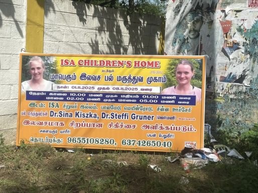 Im November befand sich Frau Dr. Kiszka, zusammen mit unsrer ehemaligen Zahnärtzin Frau Dr. Gruner, in Indien, Madurai. Vor Ort untersuchten und behandelten die beiden die Waisenkinder des ISA children Home und Menschen der nahen Umgebung. Für einen Lernbesuch übers Wochenende reiste auch Lisa aus Chennai an, deren Studium zur Zahnmedizin von uns begleitet und finanziert wird.